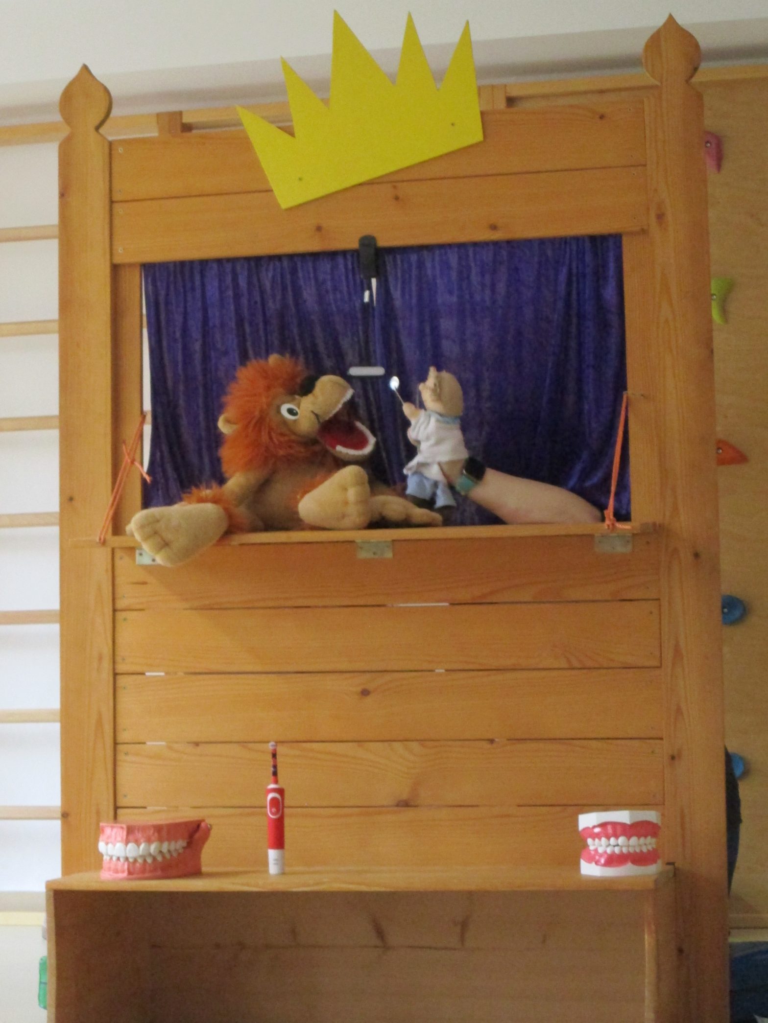 Heute war Zahntag in der Kita Sonnenhügel! Anhand eines Kasperltheaters, in dem der Löwe große Zahnschmerzen hatte, weil er nicht oft genug Zähne putzte, zeigten Dr. Julia Moller und Prophylaxehelferin Ella Völkl den Kindern, wie wichtig regelmäßiges (2x täglich) Zähneputzen ist.
